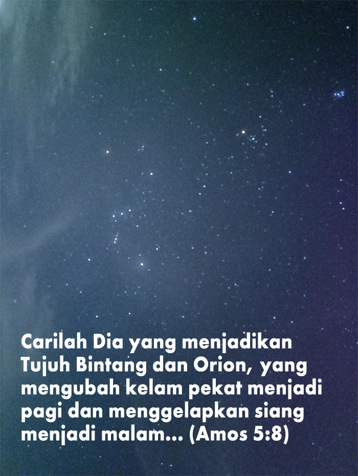 Amos 5:8 Carilah Dia yang menjadikan Tujuh Bintang dan Orion, yang mengubah kelam pekat menjadi pagi dan menggelapkan siang menjadi malam, yang memanggil air laut dan mencurahkannya ke atas permukaan bumi—Yahuwah nama-Nya.